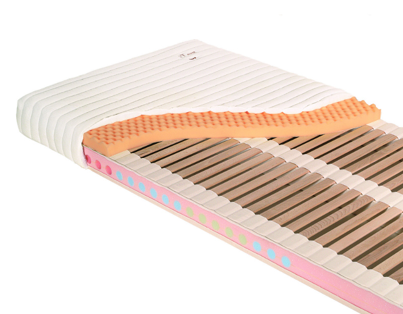 Na pružný lamelový rošt je položena prodyšná roznášecí vrstva, zajišťující rovnoměrné rozložení váhy těla bez bodových tlaků, což je nezbytné pro správný krevní oběh.
